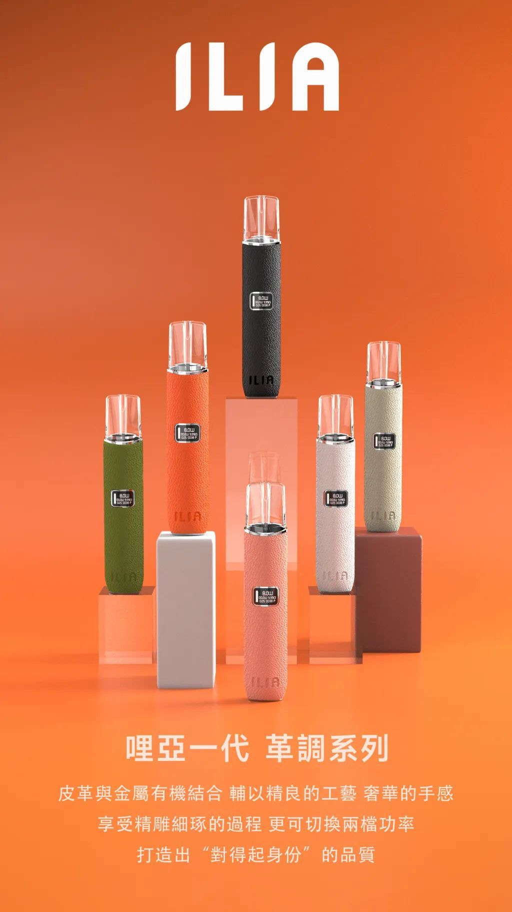 ILIA皮革主機採用高質感皮革材質打造,不僅觸感舒適,更展現獨特品味。提供多種流行配色:魅影黑、暮雪白、銀河灰、櫻花粉、Gucci綠與Hermes橙,不論你偏好低調優雅或鮮豔活潑,都能找到屬於自己的風格,讓電子煙成為你的時尚配件。